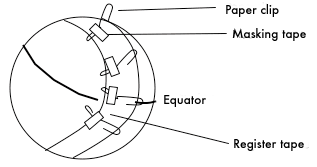 Next, cut a strip of register tape long enough to go from one pole of the basketball to the other. Using the masking tape, tape the ends of the register tape at “the poles” and note the position of the “earth’s” equator.