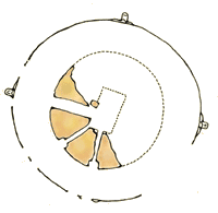 In the half-ruined higher tower of El Caracol, three openings survive. These three openings are small, narrow, and irregularly placed, suggesting that they are actually viewing shafts. It turns out that these windows do in fact align with important astronomical sightlines. Looking through these windows a thousand years ago, observers could have watched for Venus rising at its northern and southern extremes, as well as the equinox sunset. The three window shafts that remain in the upper tower of El Caracol seem to align with various celestial events on the horizon.