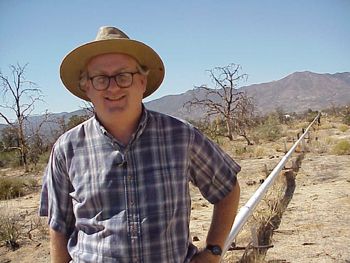 Duncan Agnew astride one of Pinon Flat's three strainmeters. |