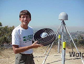 | Pacoima Dam and Occidental College host two of the 55 stations in the Southern California Integrated GPS Network ( SCIGN ). These GPS (global positioning system) receivers continuously send data up to satellites that measure hard-to-discern, constant creeping in the earth's crust. The Global Positioning System ( GPS ) is the latest technology to be employed in the study of earthquakes. This array of satellites in orbit around the earth makes it possible to measure locations on earth to within a centimeter or less. Why are these careful measurements of the earth's shapeÑcalled geodesyÑuseful to seismologists? A major earthquake is often preceded by a number of measurable changes near its epicenter. Among these so-called precursor phenomena are uplifting and tilting of the ground, caused by increasing pressure on the rock below. Both phenomena usually happen too gradually to be measured by seismometers. But precise GPS measurements can detect these subtle changes in the earth's surface, information that may make earthquake prediction possible. SCIGN is a collaboration between NASA's Jet Propulsion Laboratory, USGS (United States Geological Survey), SOPAC (Scripps Orbit and Permanent Array Center) and SCEC (Southern California Earthquake Center). |