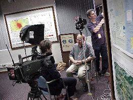 | The Seismo Lab Media Center is set up to handle the swarms of television crews the descend upon geologists after earthquakes. In fact, while we were live to the Exploratorium floor, an ABC News team waited rather impatiently outside for their turn to spin the facts. |