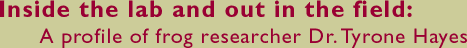 As a scientist, Professor Hayes still takes delight in the visible transformation from swimming tadpole to hopping frog, a process that he says is one of the reasons that frogs make such good research subjects. Because they develop inside a clear egg case, amphibian metamorphosis can be seen and monitored more easily than in mammals, which develop inside the mother's body, or in birds, which develop inside a hard-shelled egg. During metamorphosis, frogs are very sensitive to changes in their environment, including chemicals introduced in the water or in their food supply. With frogs as study subjects, scientists can easily see how these chemicals affect every stage of development.